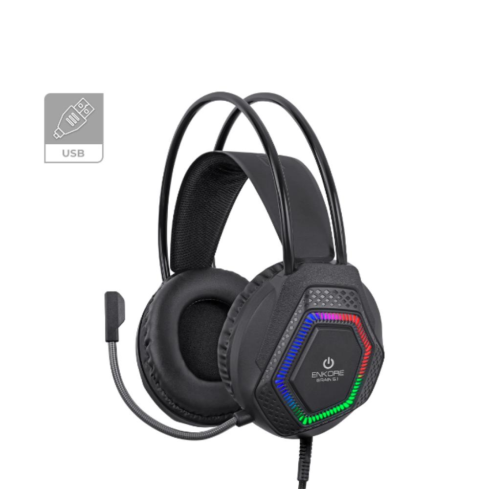 El EnkoreBrain 5.1 USB es un auricular diseñado específicamente para videojuegos.Destaca por su sonido envolvente 5.1, su cómoda construcción y su llamativailuminación LED Rainbow, que lo hace ideal para jugadores que buscan unaexperiencia inmersiva y un diseño atractivo