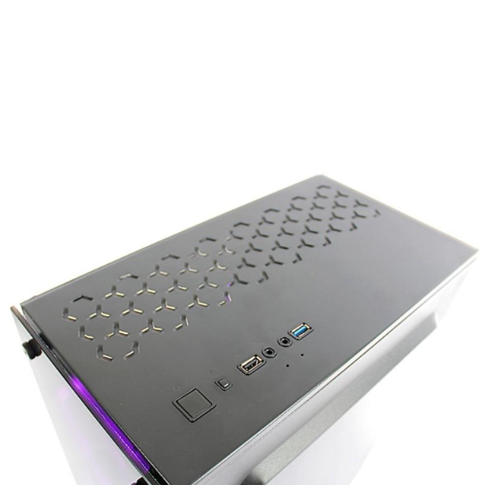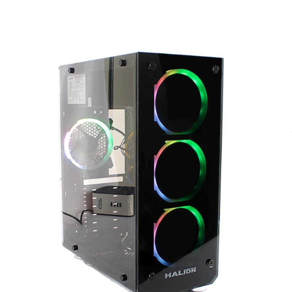 El CaseGamer Halion Sparta 842 RGB incluye una fuente de poder de 500W y cuatroventiladores RGB preinstalados para una estética atractiva. Es un gabinetetipo mid-tower de color negro que cuenta con paneles de vidriotemplado en la parte frontal y lateral para mostrar los componentes internos yla iluminación.