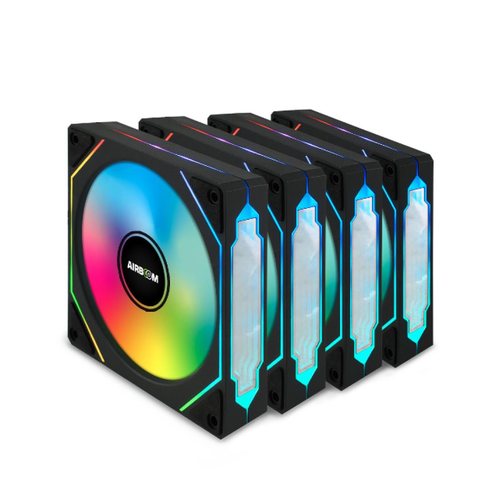 El kit deventiladores Airboom Vektor RGB AB 201 4 en 1 ARGB estádiseñado para gabinetes de PC gamer, e incluye cuatroventiladores de 120 mm con iluminación ARGB personalizable. El kit viene con uncontrolador que permite ajustar los efectos de iluminación y cuenta conconexiones para alimentación SATA y en cascada de 4 pines