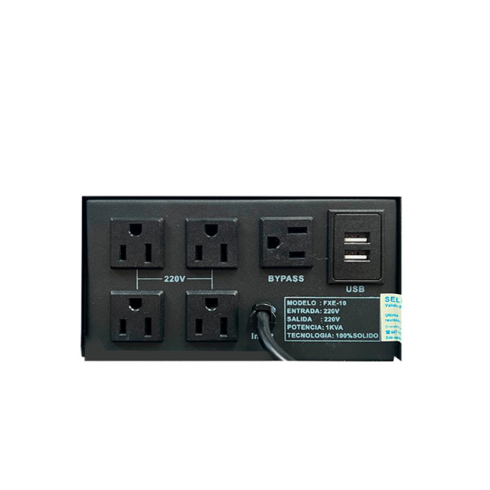 Voltaje de entrada: 220 VAC / Voltaje de salida de 220 VAC: 04 Tomas NEMA 5-15R / By-pass Filtrado: 01 Toma Nema 5-15R, USB: 02 Puertos 5V / 2A (Para cargar sus dispositivos personales y Smartphones Android). El FXE-10 de la familia FASE, con diseño moderno y compacto ofrece una mejor respuesta a las variaciones de tensión debido a un sistema de control inteligente, a través del microcontrolador, haciéndolo más eficiente y preciso. Su campo principal de aplicación es en cómputo y cabinas de Internet.