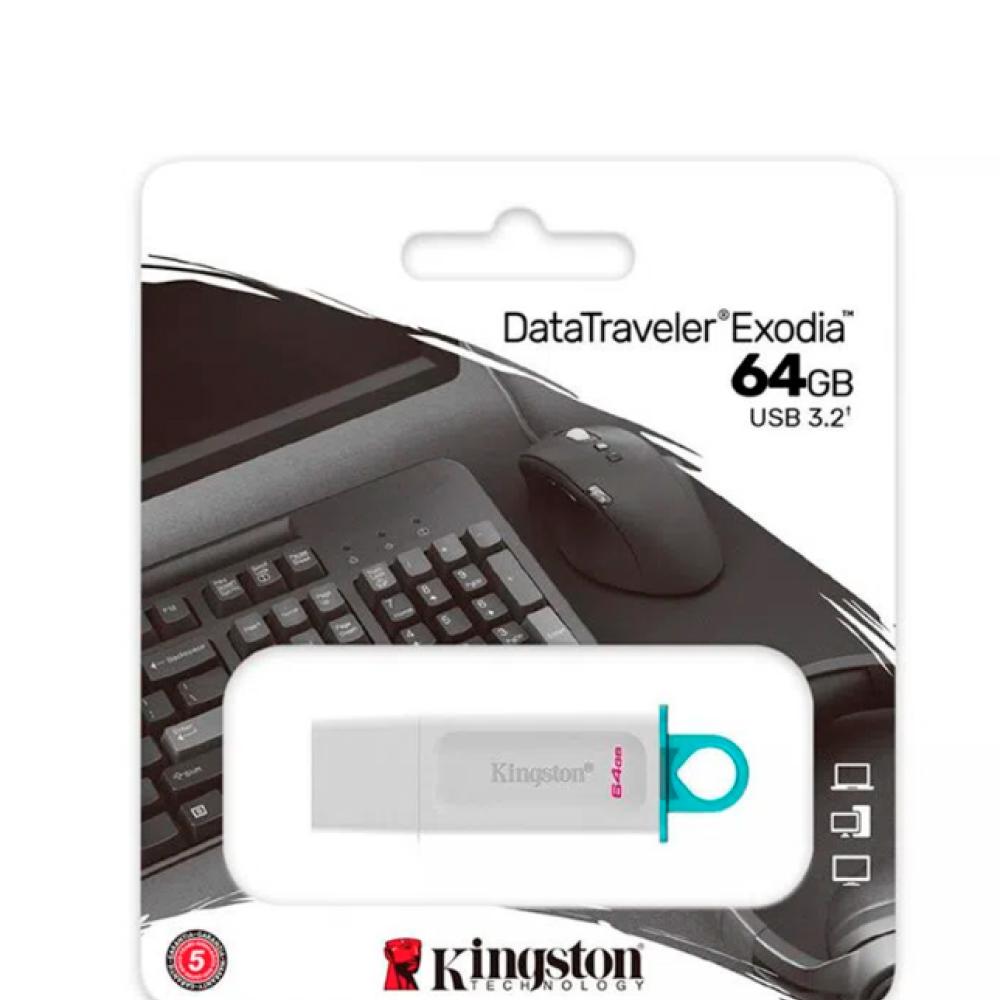 La memoria USB Kingston con código KC-U2G64-5R es un modelo Data Traveler Exodia de 64GB, con interfaz USB 3.2 Gen 1 y una velocidad de transferencia rápida. Es compatible con múltiples sistemas operativos y tiene un diseño compacto y ligero, disponible en color blanco con acentos celestes.